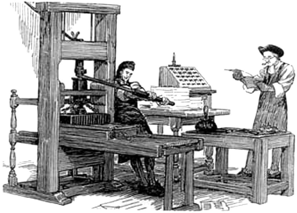 Pada abad 14 cara mencetak sudah dilakukan di daerah Cina, orang-rang cina terus berinovasi dalam bidang tinda dan mereka berhasil menciptakan tinta dan block printing. Namun perkembangan di eropa jauh lebih maju bila di bandingkan dengan Cina, awal tahun 1950 di Eropa budaya berkembang pesat yang berimbas pada kebutuhan alat cetak dokumen yang cepat dan merah. Seorang pengusaha asal Jerman Johannes Guternberg berhasil menciptakan mesin cetak. Dengan adanya penemuan mesin cetak semua menjadi lebih mudah, buku yang pertama di cetak secara masal menggunakan mesin cetak yaitu Alkitab.